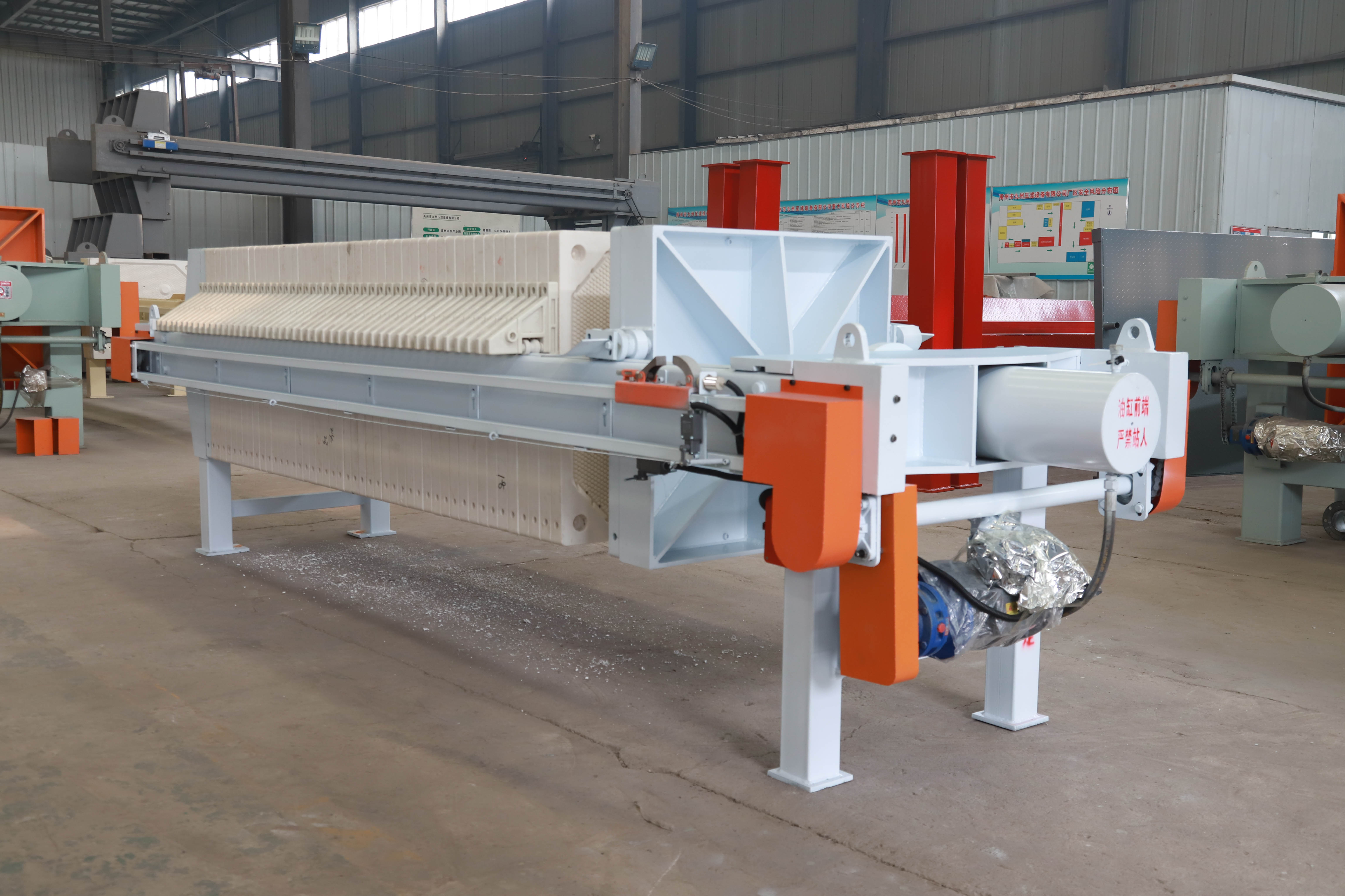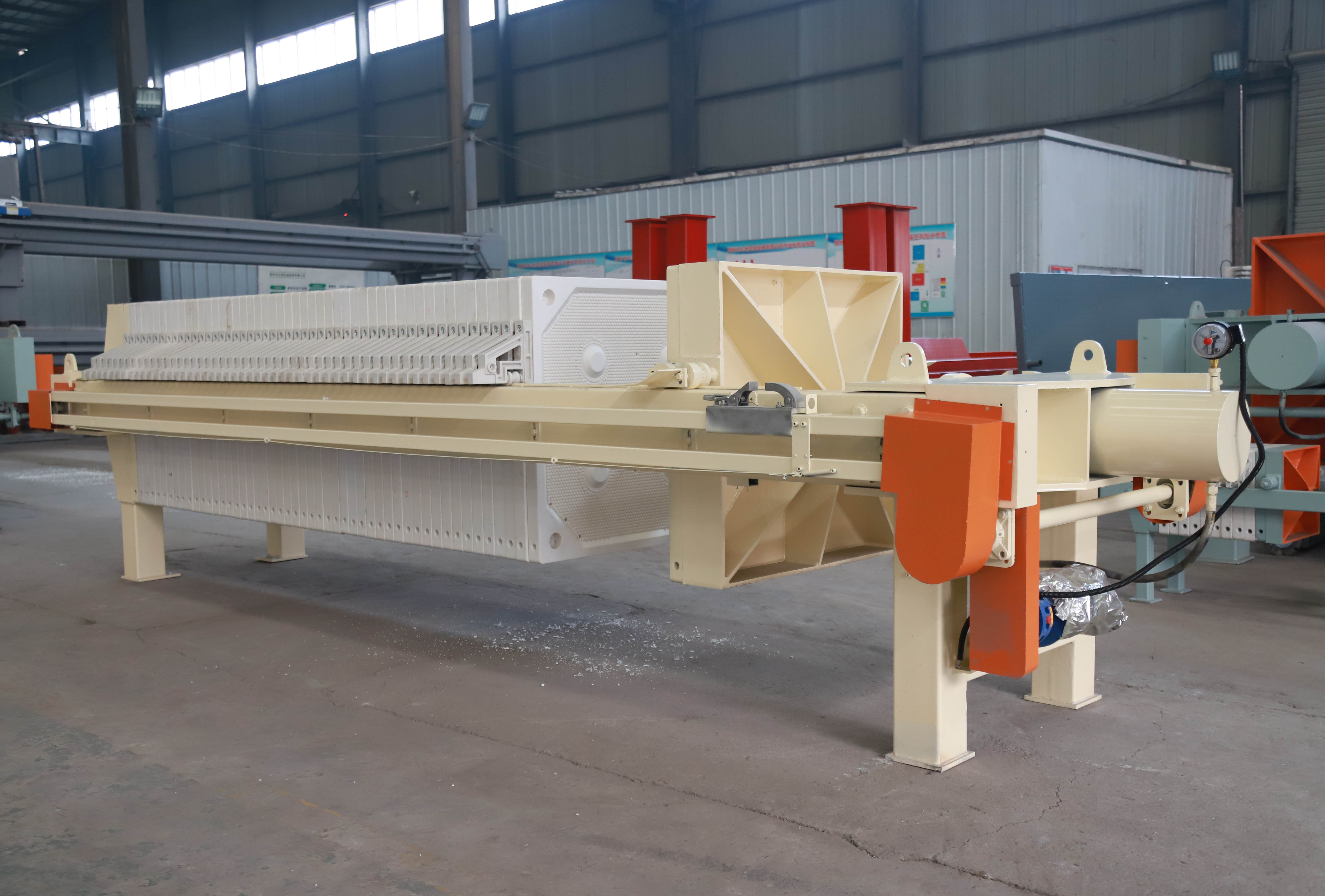 廂式壓濾機工作原理是由濾板排列組成濾室(濾板兩側(cè)凹進,每兩塊濾板組合成一廂形濾室)。